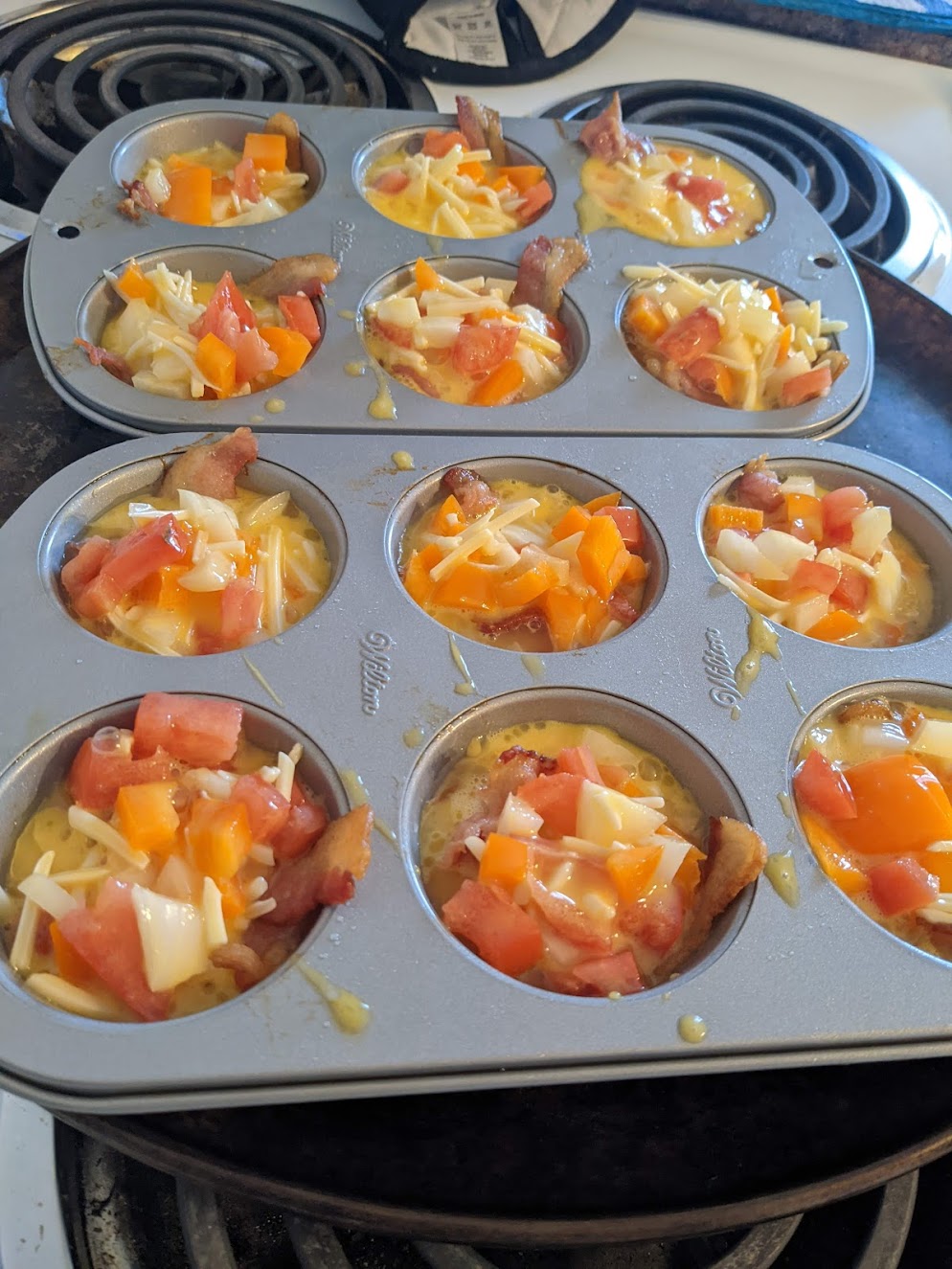 - After the bacon has baked for 10 minutes, pour the contents of the bowl into the muffin tins evenly. Ensure that you do not over pour, leaving roughly an inch of space, so any expansion does not over flow. The bacon will not be fully cooked at this point.